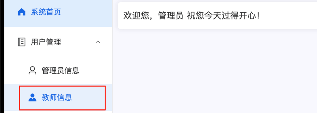 管理员点击”新增”按钮 弹出空白表单,填写教师信息(用户名、姓名、性别等) 点击”保存”按钮提交